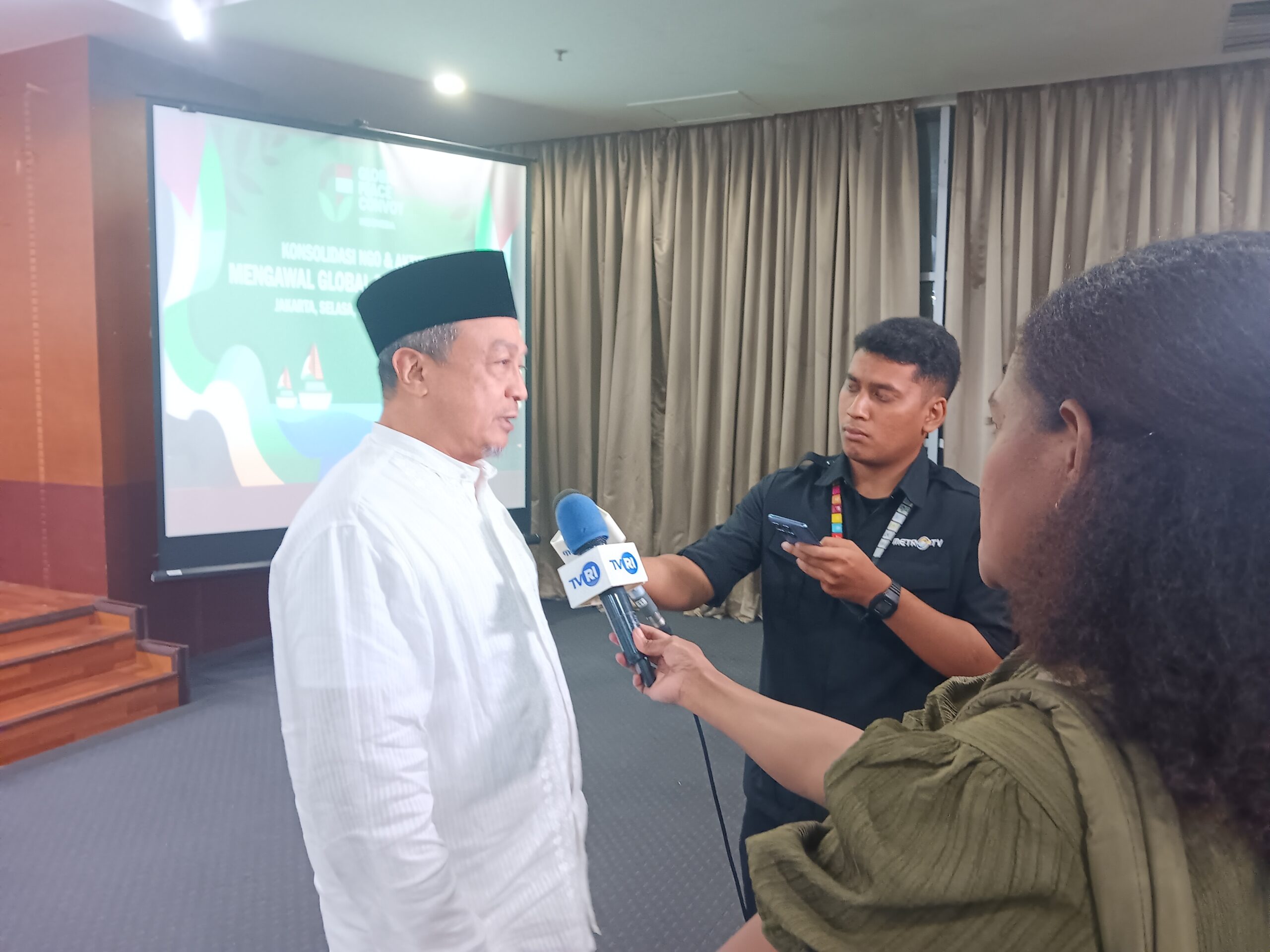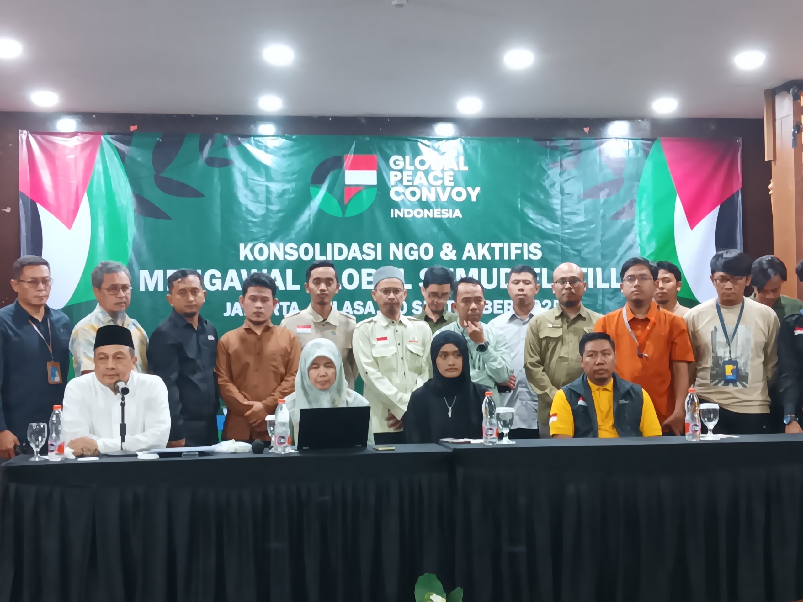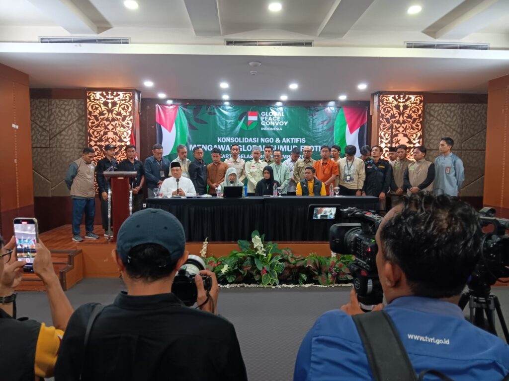 JAKARTA–Global Peace Convoy Indonesia (GPCI) menggelar konferensi pers di Hotel Balairung, Jakarta, Selasa (30/9) malam, untuk menyampaikan perkembangan terbaru perjuangan Global Sumud Flotilla (GSF) yang kini telah memasuki zona kuning, kawasan rawan di perairan dekat Gaza.